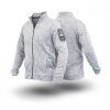 Šedá měkká bunda se zipem vpředu a na kapsách.